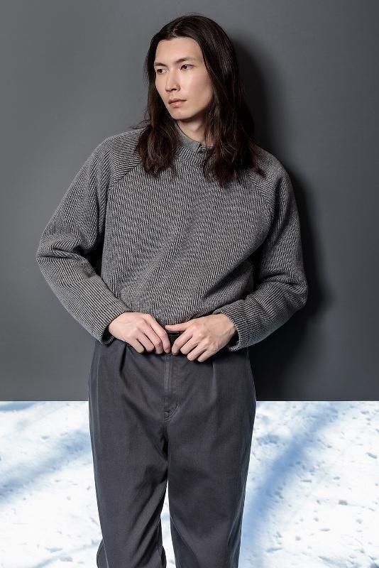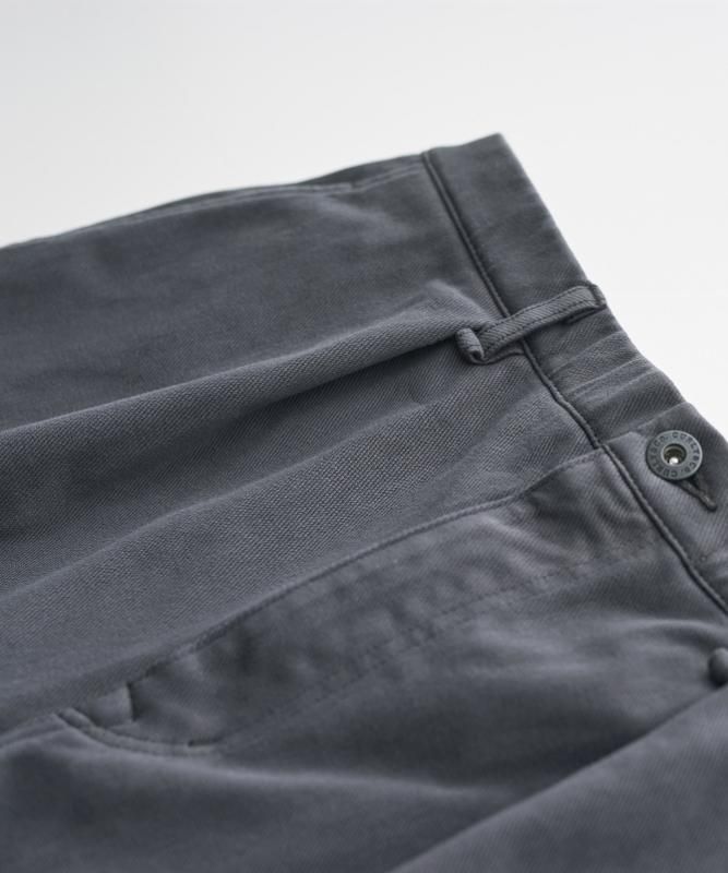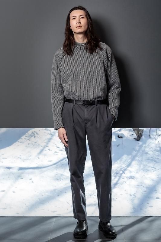 独自のストレッチインレイ素材を用いた1タックパンツ。ハイゲージで編み立てることで、ムラ感が強くハリのあるシャープな表情に仕上げています。編み素材ならではの柔らかい肌当たりと伸縮性を持ち、優れた着心地を実現。ウエストは1タック、後のみイージー仕様で腰周りに程良くゆとりを持たせ裾にかけてしっかりとテーパードを効かせたスラックスシルエット。型紙のベースはスラックスタイプを採用。カジュアルなアイテムはもちろん、シャツやジャケットなどにも合わせやすいシルエットになっています。