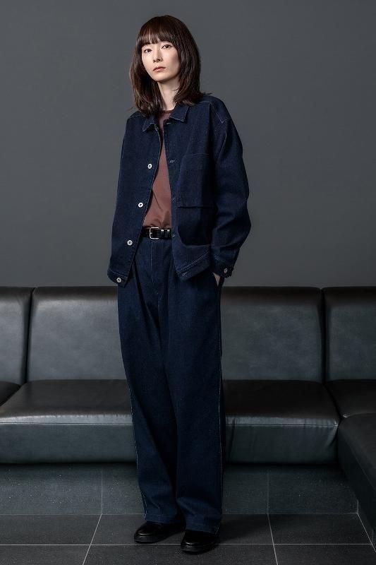 独自のストレッチインレイ素材を用いたトラッカージャケット。糸の表面だけが染まり芯部分は白いまま残るロープ染色された糸を使用し、深みのある色に仕上げたニットデニム素材。ハイゲージで編み立てることで、ムラ感が強くハリのあるシャープな表情に仕上げており、着込んでいくことで自然に色落ちし、味わい深い表情に変化していきます。編み素材ならではの柔らかい肌当たりと伸縮性を持ち、優れた着心地を実現。前シーズンからヨークやポケットなど少しずつ削ぎ落とし、細かいディテール部分を見直すことで、より軽いデザインに刷新。それによりアウター使用は勿論のこと、冬はカーディガンの様にミドラーとして着用する事も可能となりました。