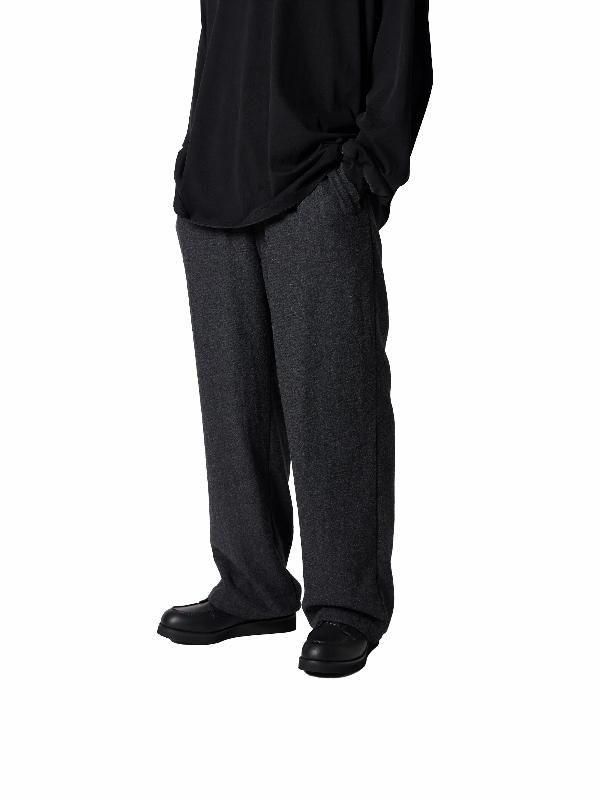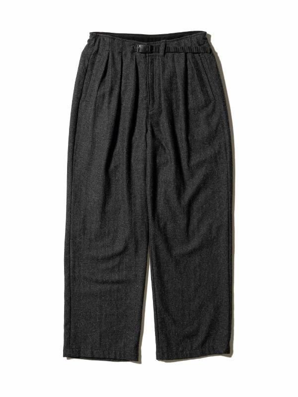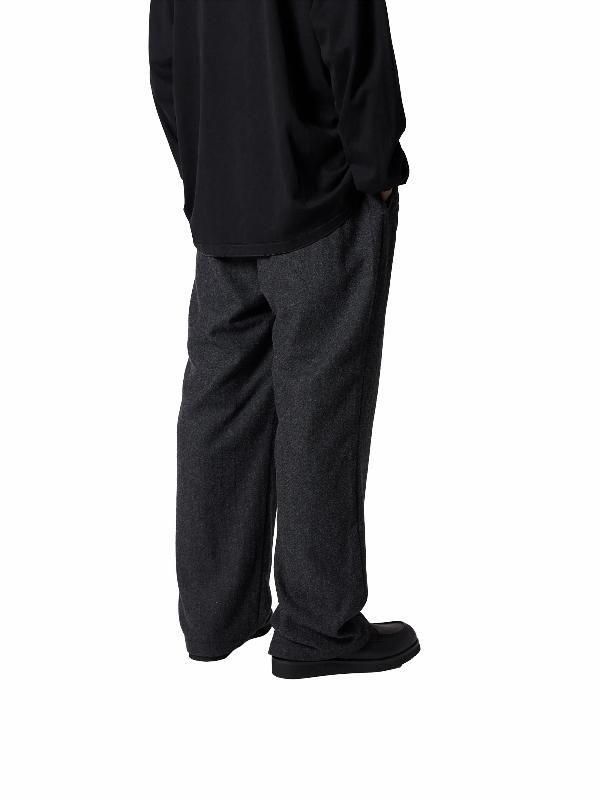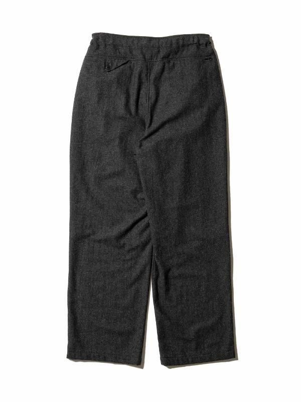 ウール、化繊がミックスされた起毛ツイルの生地を使用。微起毛でしなやか且つ、程よい肉厚さで耐久性にも優れています。製品にウォッシュ加工を施し、程よいシワが出るよう仕上げています。ウェストにはオリジナルバックルを装備。イージー仕様ながらもタックが入れてヒップ周りにゆとりがあるワイドソルエットになります。