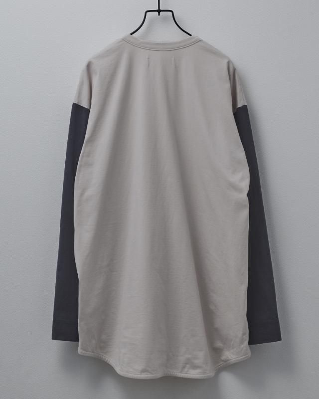 通常メリハリの効いた色で切り替える事が多いベースボールTを、くすんだ色で切り替えることで落ち着いたモダンな表情に仕上げている。衿は生地を4つ巻きで仕上げ、だれないようにし、袖付けはジャケットのような立体裁断を応用して付けられている。程よくゆとりのあるサイズ感で仕上げることで1枚着でも存在感をだせるようにしている。