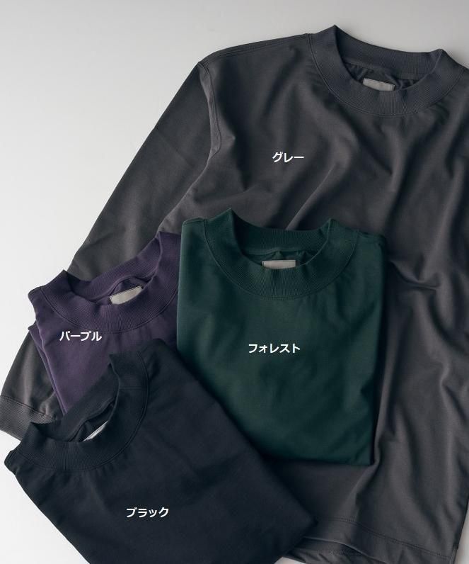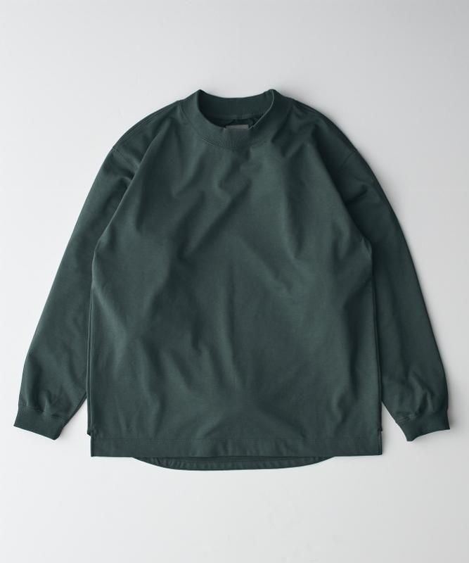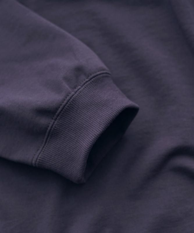 コットンミニ裏毛を用いたハイクルーネックのロングスリーブTシャツ。希少性の高い36ゲージのハイゲージで編み立てながらも、薄くプレーンにならないよう仕上げ加工を工夫し、柔らかさと膨らみを持たせることで、エレガントでありかつカジュアルな素材感になりました。どんなコーディネートにも馴染み、天竺のTシャツよりも厚くスウェットよりも薄い着用期間も長いアイテム。一般的なクルーネックよりもリブ幅を若干高くしたハイクルーのデザイン。
