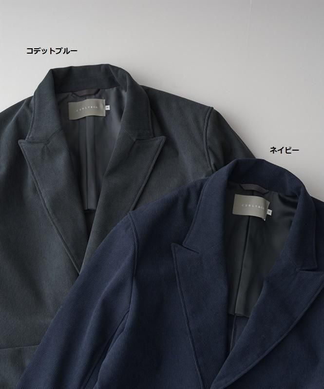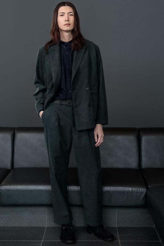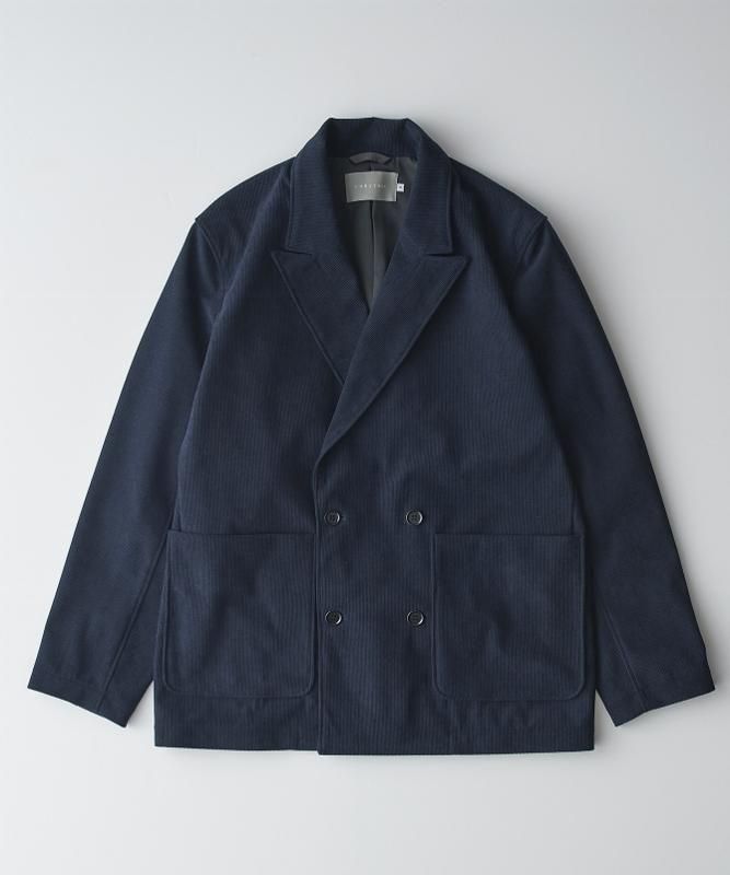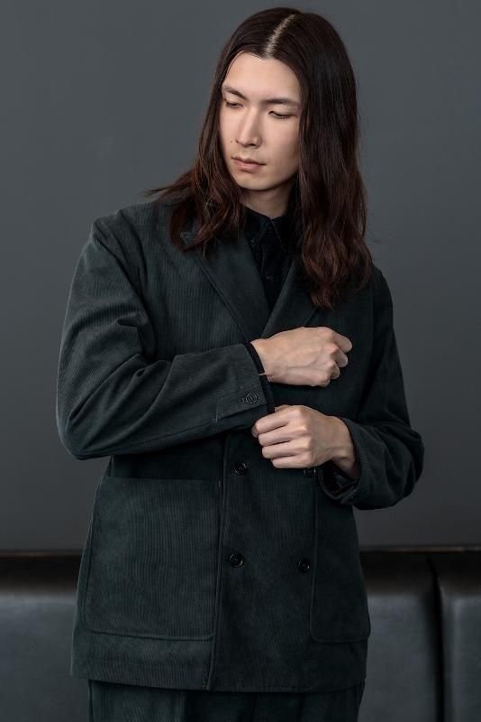トリコット素材のポリエステルコーデュロイを用いたセミピークドラペルの4ボタンダブルブレステッドジャケット。ビジネスシーンでもタウンユースでも両用できるよう適度なゆとりのあるボックス型シルエット。布帛のコットンコーデュロイと比べると野暮ったくなくスッキリと見え、通常のパイルカットコーデュロイと異なり毛房が抜けることも無いのでお手入れも簡単。適度な張り感があるのでボタンを外して着用する時もシルエットが崩れることなく綺麗に保てます。ポリウレタン未使用ながらナチュラルなストレッチ性を持たせているので、ストレスフリーな着心地。