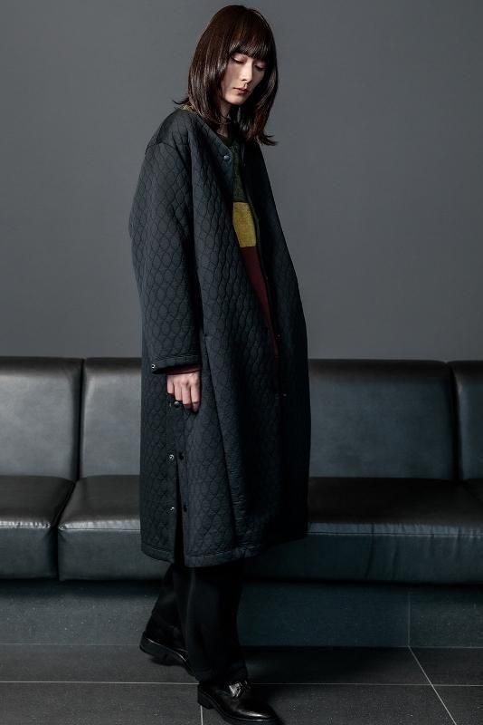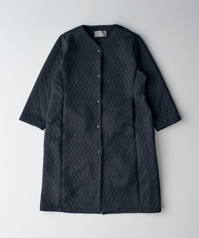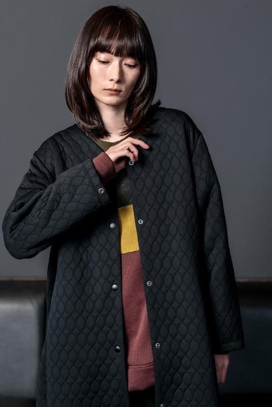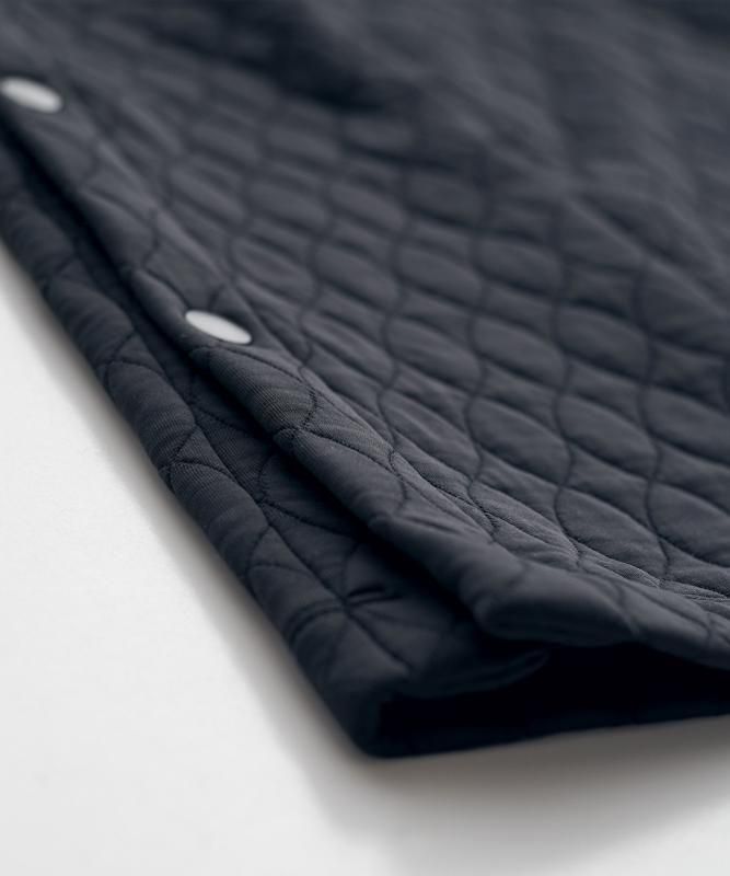 キルトジャカードニットを用いたロングカーデコート。リサイクルポリエステルのハイマルチ糸を使用した、パウダータッチな表面感が特徴。あくまでもキルティングを模したジャカード編みなので、本物のキルティングの様に糸切れや綿の飛び出し問題がなく安心して長く着用できます。またシワにもなりにくく取り扱いも楽。CURLY&Co.定番アイテムのスナップカーデの着丈を長くしたシンプルなデザインで、裾両サイドにドットボタン付きのベンツをあしらいました。開閉することでシルエット変化を楽しめます。このアイテムの肩幅や袖丈はレディース着用を想定したパターンを採用しています。