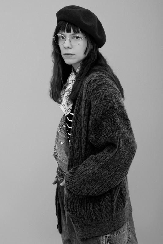 雪に包まれた田畑や木々、車に踏み固められた轍などの雪景色をイメージしました。身頃中央と袖の柄で雪に覆われた畝や畦道を表し、身頃横のケーブル柄で轍を表し、身頃脇の柄で雪が積もった木々を表しています。