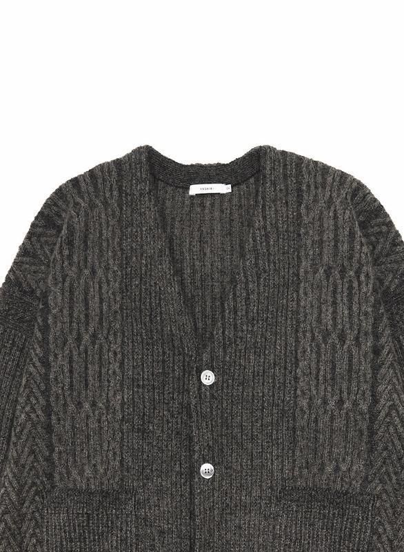 プレーティング編みと言われる表目側と裏目側で異なる糸を編む技法を使用し、表と裏で糸の色を変えて、2色で編むことで奥行きのある表情に仕上げました。希少なキッドモヘア混の柔らかで優しい光沢のある糸を使用しています。