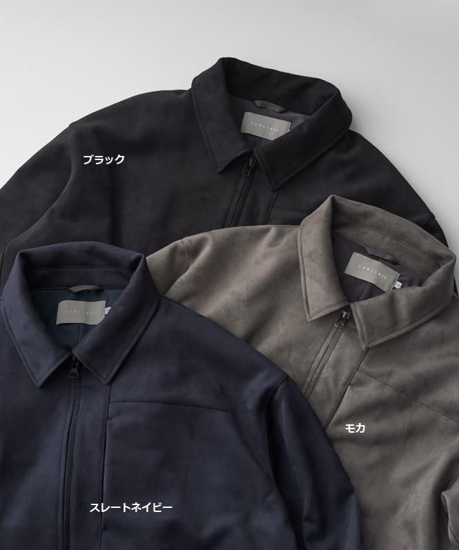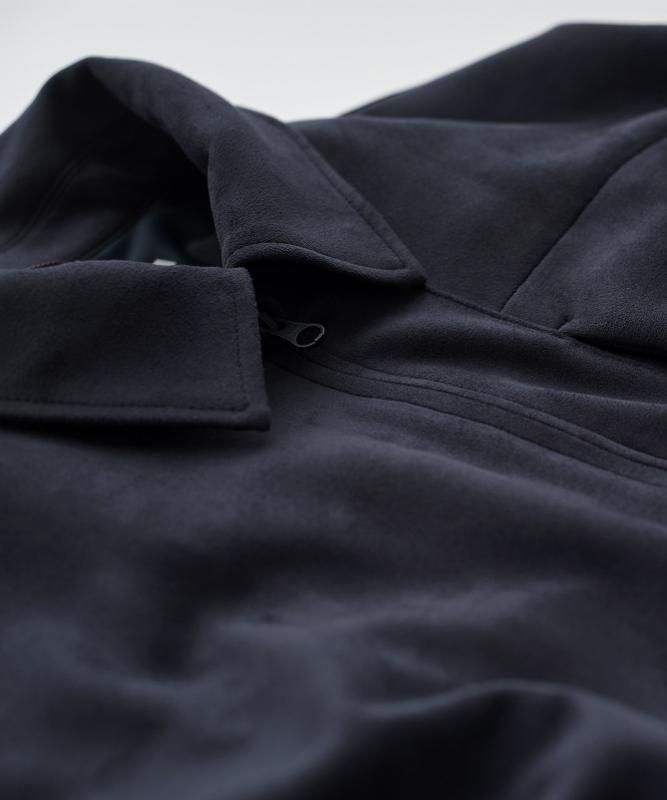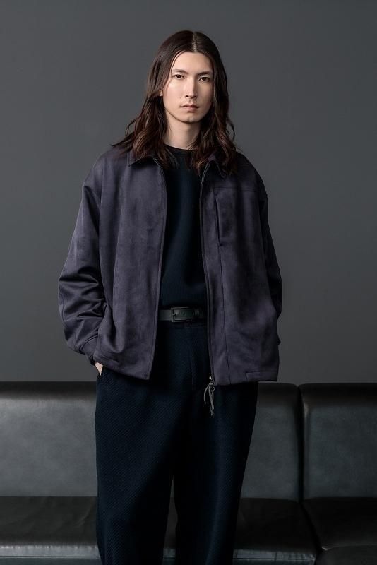リサイクルポリエステル原料のダンボールスエードを用いたジップアップブルゾン。リラックス感のあるゆったりとしたシルエットなので程よいドレープが生まれ、スエード生地特有の陰影が綺麗に出ます。身頃には薄手のフリースを、袖には滑りの良いトリコット裏地を用いています。裾にはドローコードがあるので、ブラウジングしてシルエット変化を楽しめます。前袖はシャツ袖で後ろ袖がヨークスリーブのスプリットスリーブ仕様。左身頃の胸にはシームポケット、右身頃の裾内側にはパッチポケット有り。