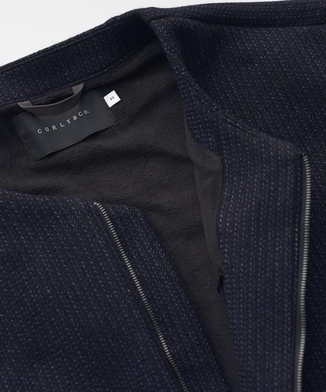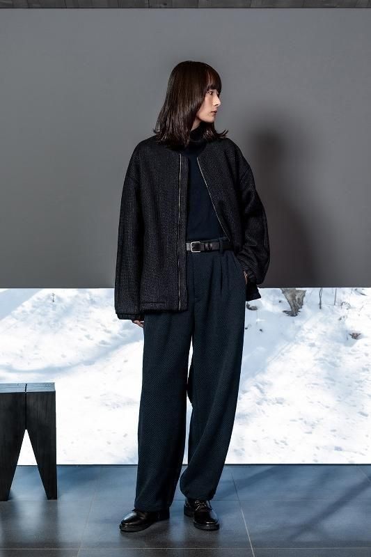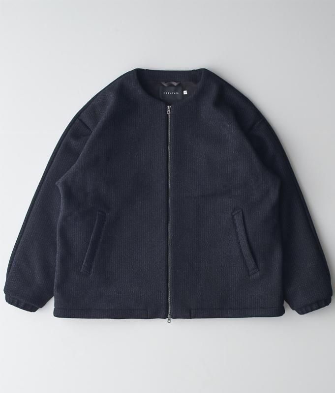 ビーチクロスを用いたジップフロントのブルゾン。ビーチクロスとは20世紀初頭にアメリカ東海岸で誕生したウールとコットンの混紡糸をラッセル編み機で編み立てた生地で、寒冷地の防寒着として使用されていたもの。その見た目と構造をベースに、軽量でサステナブル原料を用いて現代に合わせてリプロしました。粗野な生地を敢えてミニマルなノーカラーのボックスシルエットデザインに落とし込むことで、モダンとクラシックが合わさった独特なアイテムに仕上がりました。身頃裏には薄手のフリースを使用しているので長い期間着用が可能。インナーにフードやタートルを合わせても襟元がごわつかず、すっきりとした印象を与えてくれます。シャドーストライプを活かしたスプリットラグランスリーブで前後の表情に変化を出しています。裾のドローコードを絞ることでシルエット変化も楽しめます。
