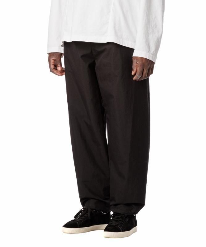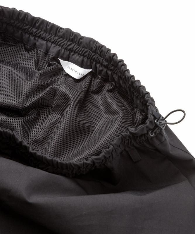 特殊なコットンナイロン撥水ツイル生地使用した、総裏イージーパンツです。シルエットの特徴はゆったりシルエットから若干裾にかけてテーパードしています。生地の特徴は経糸にオーガニックコットン、緯糸にリサイクル漁網ナイロンを使用した、表面にしっかりとしたシャカシャカ感がある素材です。裏地のCOOLMAXメッシュは爽快感があり、速乾性にも優れた素材です。ウエストにはゴム&ゴム紐が通ってます。また裾にもゴム紐が通ってますので、シーンに合わせて絞れます。