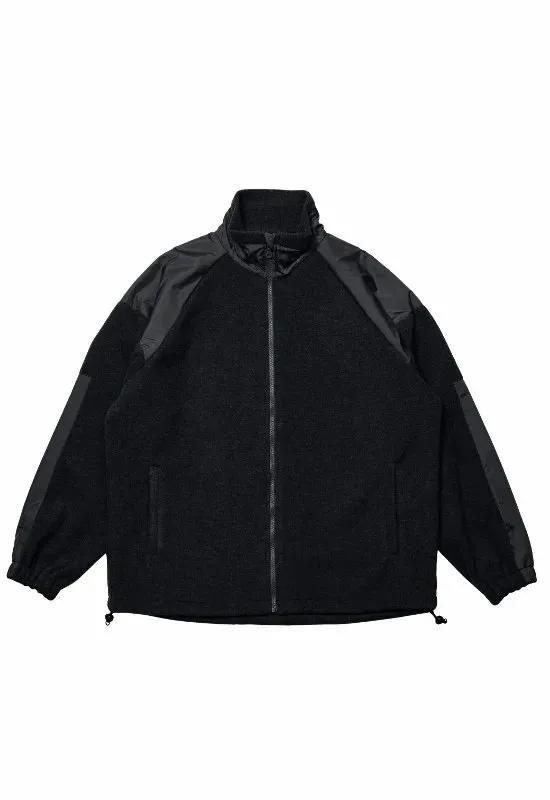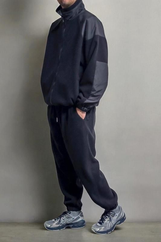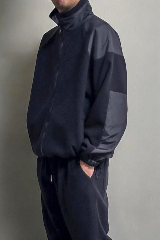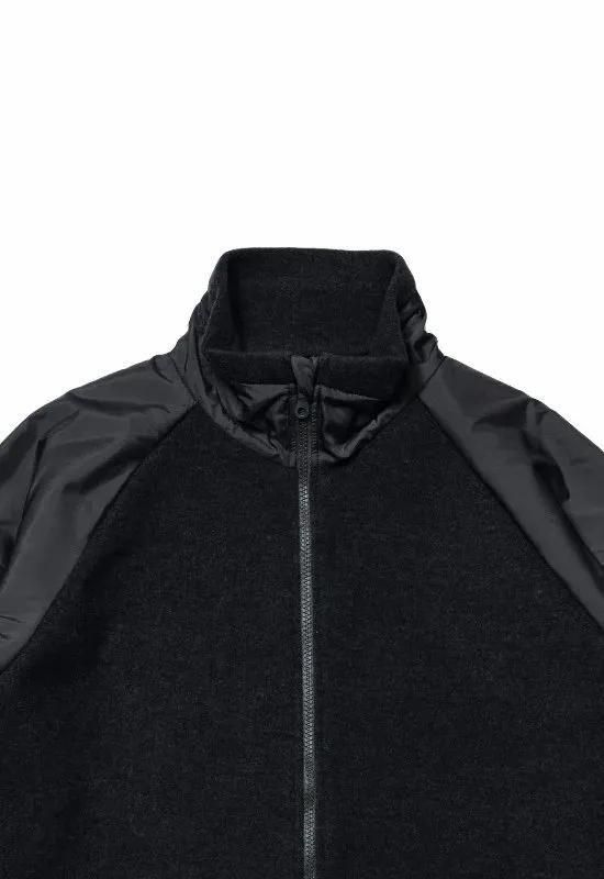 縮絨させ起毛したあとに表面の毛羽を刈ったスムースなしっとりした肌触りのフリース素材を使用。肉厚でフカフカながら軽くて暖かいです。肩、肘、襟の上は別生地(リップストップ)を重ねています。US ARMYのECWCSよりインスピレーションしたデザインです。裾にはドローコードを通してますのでお好みで絞れます。後ろが少し長く、全体的にゆったりしたシルエットです。