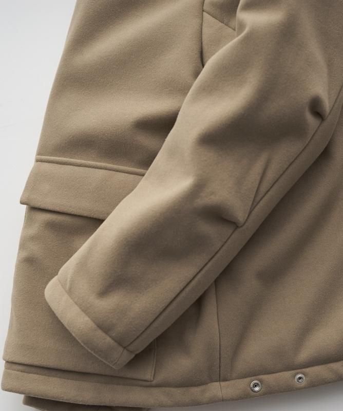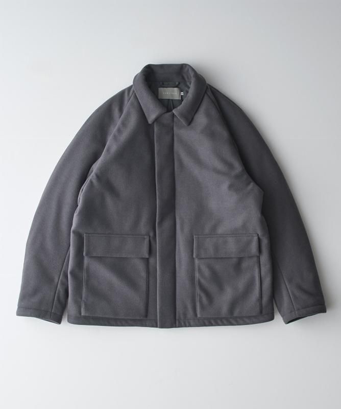メルトンライクな中肉ジャージーを用いたジップアップパフジャケット。吸湿発熱機能のあるリサイクルポリエステルをベースに、レーヨンとアクリルをブレンドする事でソフトな仕上がりになっています。中綿には発熱、蓄熱性、静電気抑止性の高い機能性素材コアブリッド™️を使用。シンプルなショート〜ミドル丈のラグランスリーブ、フロントはジップ+ドットボタンでダブル防寒仕様、ジップは軽量化のため樹脂製を使用しています。ウエストのフラップ付きパッチポケットには上からも横からも手が入れられます。襟はスナップダウン仕様なので落ち着きも良く、ドットボタンを全て隠したミニマルな仕上がりは、どんなコーディネートにも馴染みます。身頃裾も袖口もストレートなラインに仕上げていますが風や冷気が強い時はドットボタンを閉じてご着用ください。左胸内側にはジップ付きのシーム内ポケット、右身頃裏の裾には大きめのパッチ内ポケット付き。