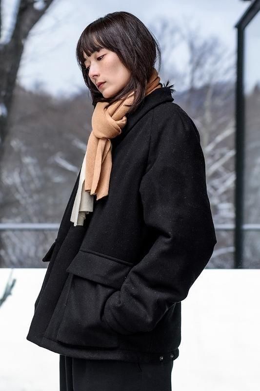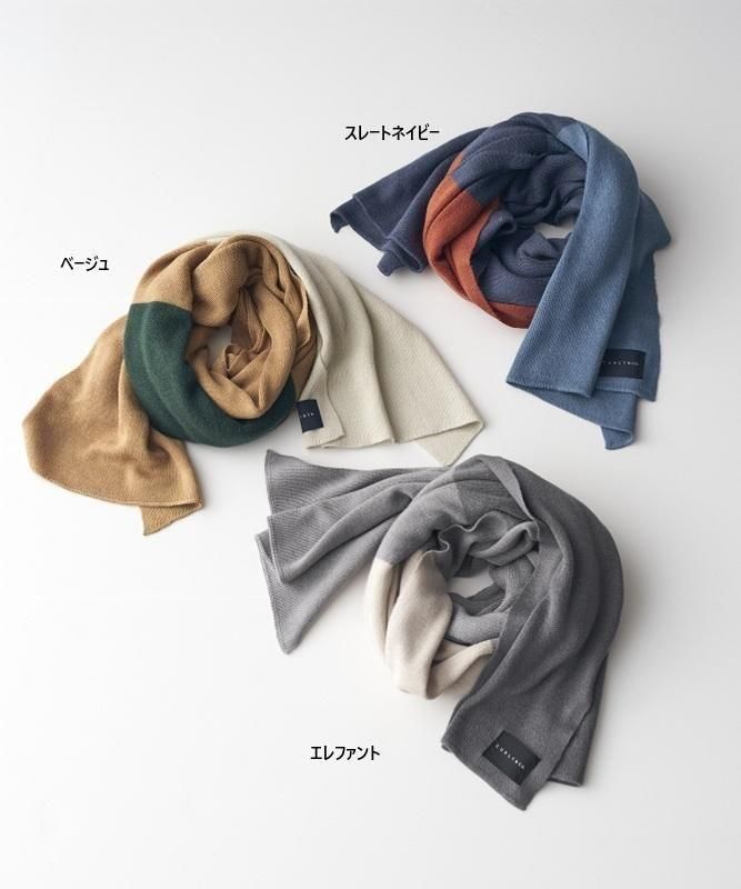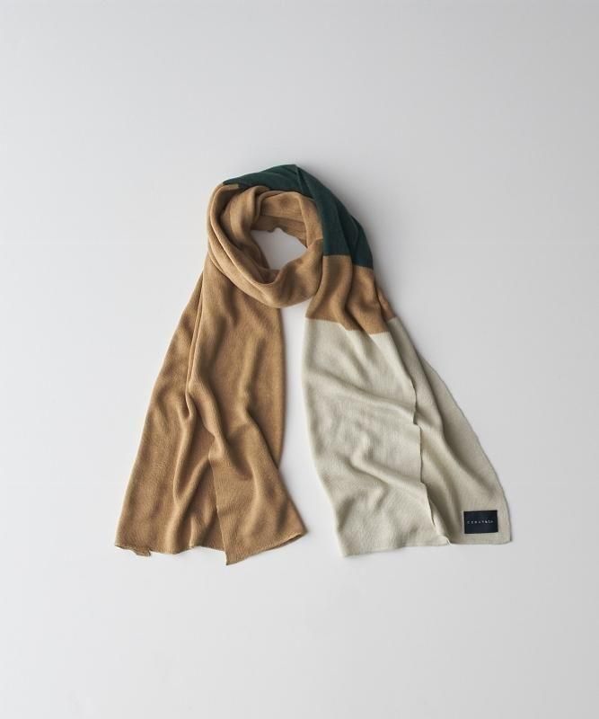 シルクニットを用いたパネルカラーのスカーフ。製品ではなく糸の状態で起毛をかけた特殊なシルク糸で編み立てることで、カシミヤのような滑らかでソフトなタッチに仕上がりました。巻き方によって見え方にそれぞれ変化が出る様に、カラーブロックのサイズや位置を吟味したデザイン。暗くなりがちな秋冬シーズンのコーディネートが一気に華やかになります。風合いと軽さを重視してサイズは160cm x 45cmと少しコンパクトにまとめました。